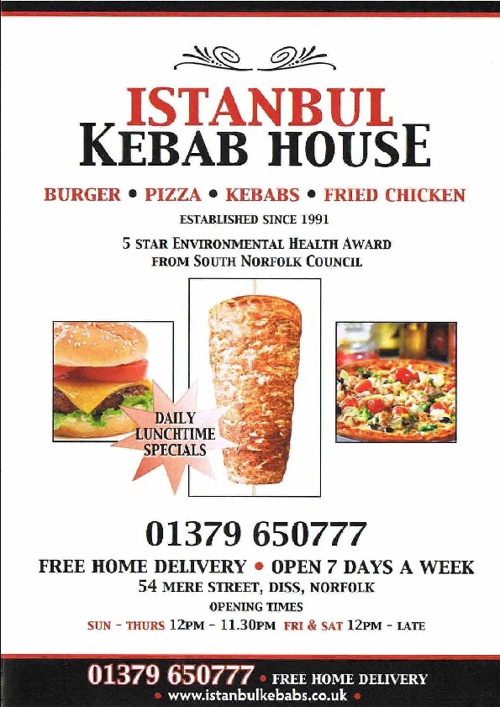 Place your order easy as 1 2. Restaurant location Istanbul Kebab House Diss You can find us in 54 Mere Street Diss IP22 4AG area. Menu Istanbul Kebab House Diss.
